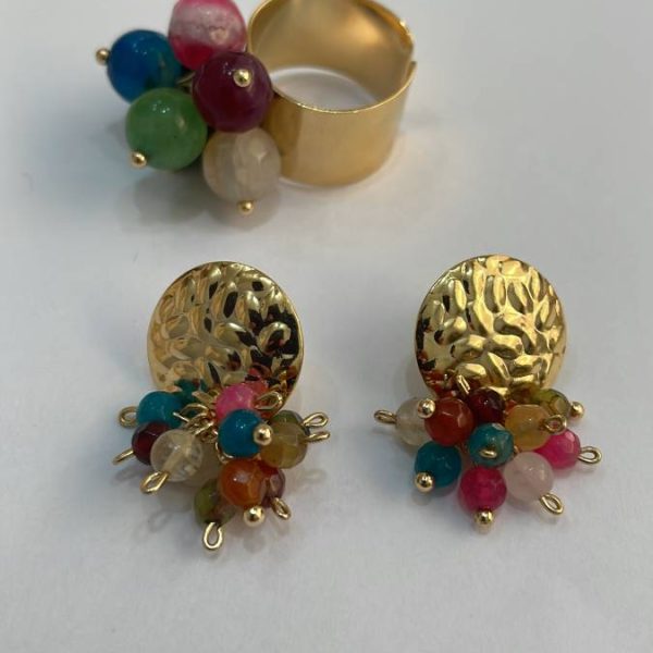 Conjunto aros más anillo baño oro piedras ágata colores