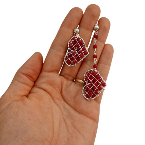 Conjunto cadena plata ley 925 más aros baño plata corazones en alambrismo rojo